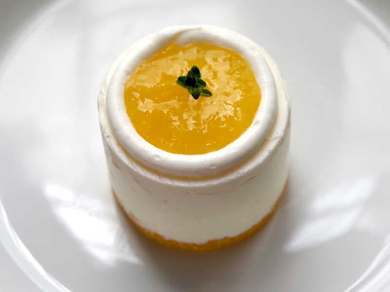 自家製のパール柑マーマレードを入れたレアチーズケーキ。美しい黄色の果肉だけで作ったソースをかけて、見た目も爽やかに仕上げました。